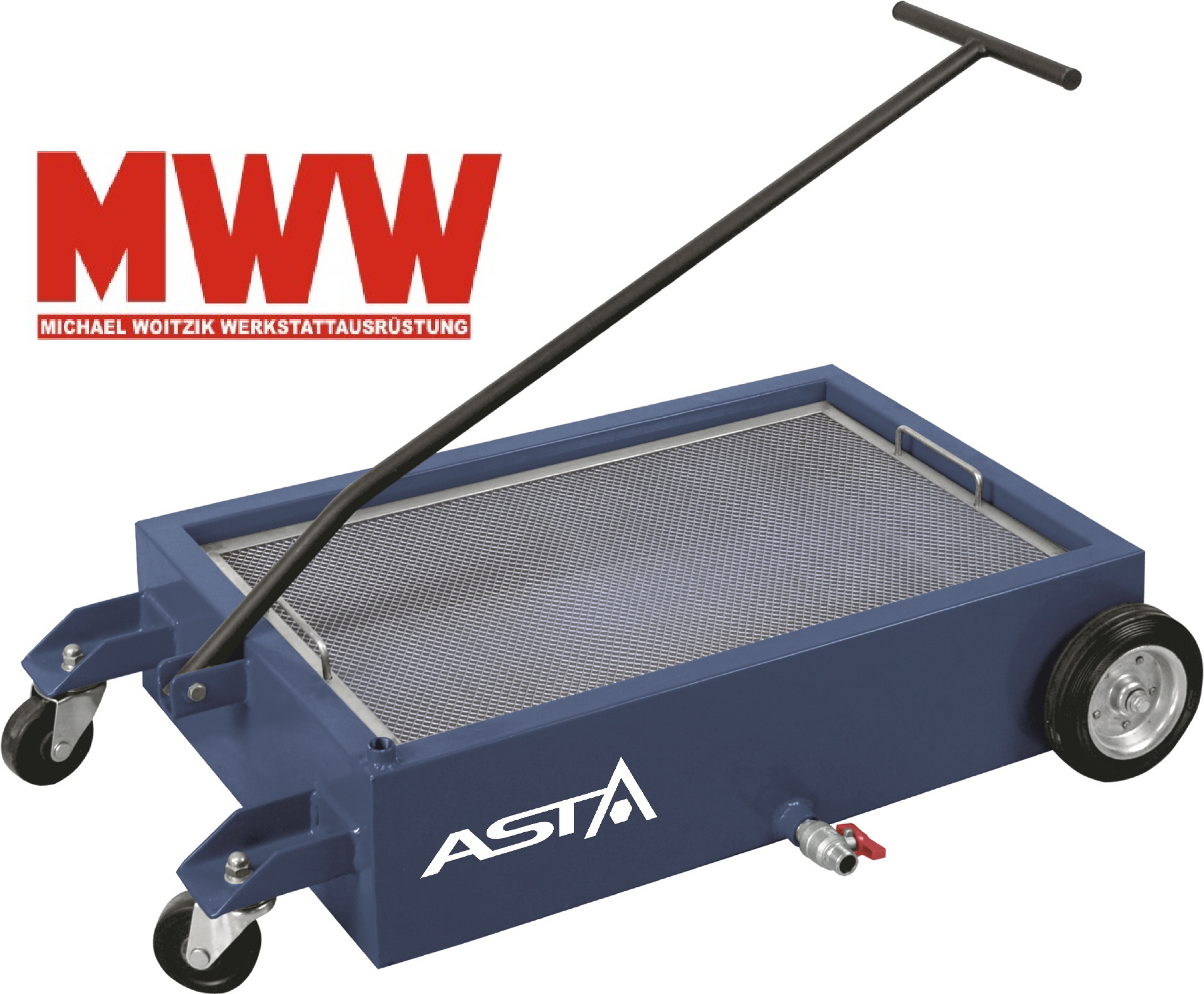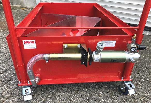 Fahrbare, ebenerdige Ölablass-Auffangwanne mit ca. 220 Ltr. Auffangvolumen, ausgestattet mit Anti-Schwellblechen, pneumatischer Entsorgungspumpe, 2 x feststehende und 2 x lenkbare Räder mit Feststellbremse, Schiebevorrichtung kann abgenommen werden. Pneumatische Entsorgungspumpe mit Ansaug-Schmutzsieb und Druckregler inkl. Manometer und Hydraulikanschluß für flexiblen Schlauchanschluß beim Entleeren der Wanne. Förderleidtung je nach Viskosität und Abgabelänge des Schlauches ca. 10 Ltr./min. |